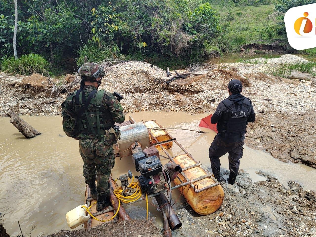 Tropas de la Octava Brigada del Ejército Nacional en coordinación con la Brigada Contra la Minería Ilegal, el Batallón de Inteligencia Militar N.°5, el Comando Aéreo de Combate N.°1 y el CTI de la Fiscalía, lograron incautar maquinaria y elementos con los que se realizaban explotación ilícita de yacimientos mineros, quienes usaban la modalidad de sistema cúbico y tipo dragas para la extracción de oro aluvial.