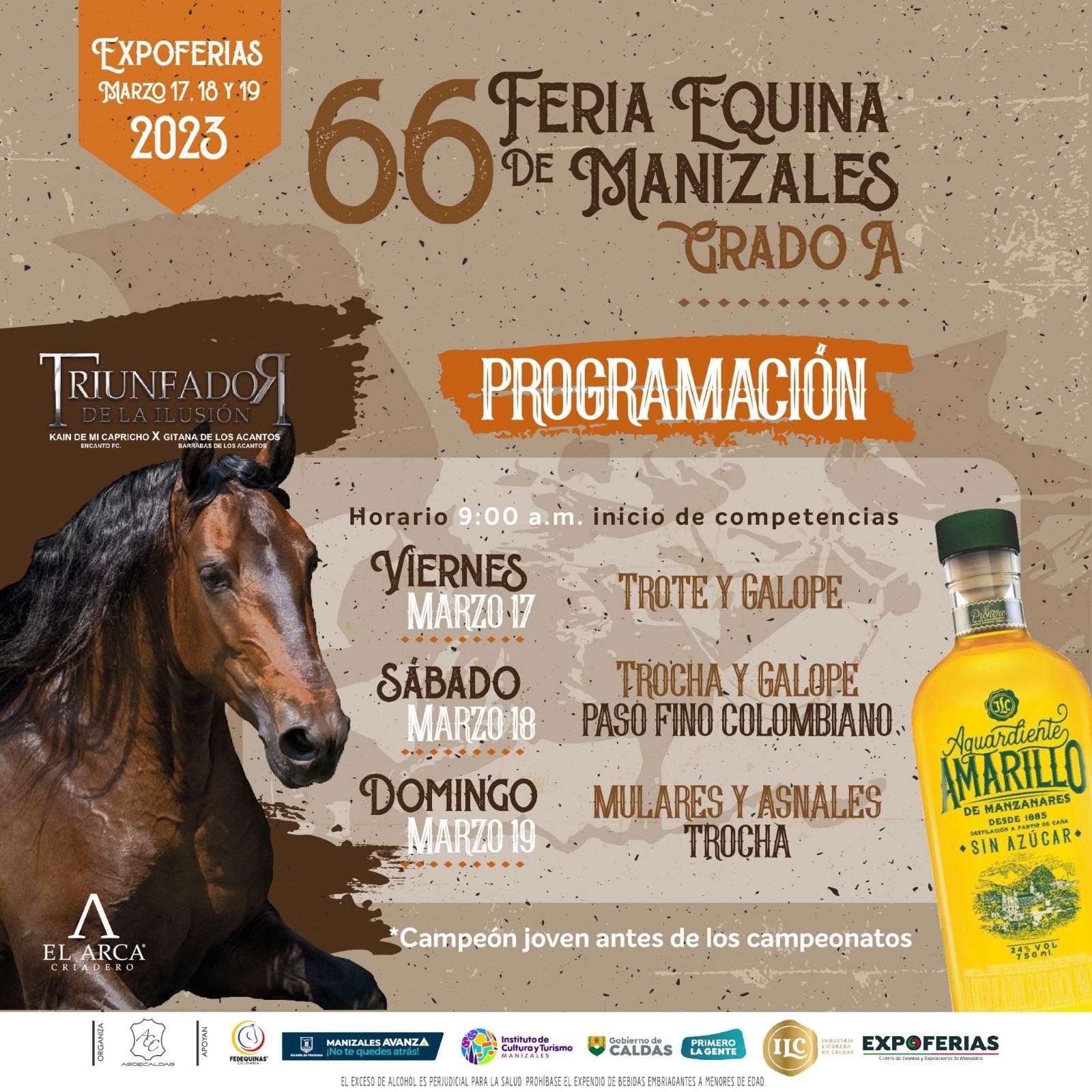 La Industria Licorera de Caldas (ILC) se vincula nuevamente como patrocinador oficial de la Feria Equina de Manizales Grado A con su marca Aguardiente Amarillo de Manzanares. Este evento es el segundo de mayor importancia en la ciudad y convoca a aficionados a los caballos de todo el país. La 66 Feria Equina de Manizales dio inicio hoy en Expoferias y se extenderá hasta el próximo domingo.