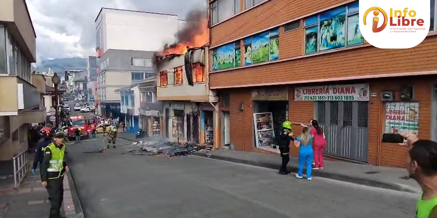 A esta hora, organismos de socorro atienden un grave incendio estructural en la Carrera 21 con Calle 25, en la zona posterior al supermercado Ara del centro de Manizales, a una cuadra del Parque Bolívar.