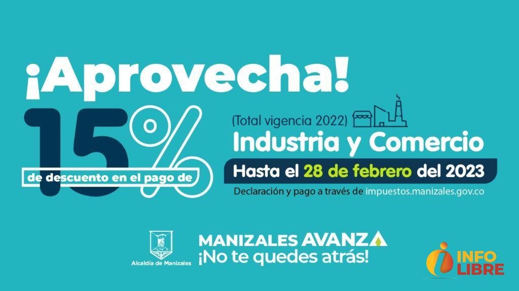Los contribuyentes manizaleños del impuesto de Industria y Comercio y sus complementarios de Avisos y Tableros que deseen acceder al descuento por el pago anticipado de la vigencia 2022, podrán hacerlo si realizan su declaración y pago antes del 28 de febrero del 2023. Para esto, los usuarios deben estar al día en las vigencias anteriores.