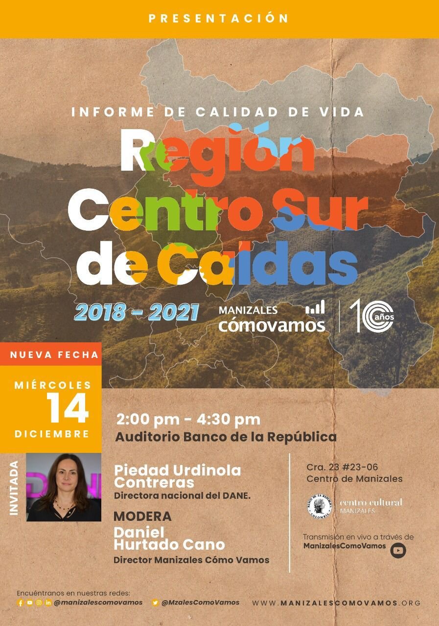 Este es tan solo un anticipo de los resultados del «Informe de calidad de vida de la región centro sur de Caldas (2018-2021)», que desde el Cómo Vamos presentaremos hoy, miércoles 14 de diciembre de2022, a las 2:00 p.m. en el Auditorio del Banco de la República (centro) y a través de las redes sociales de Manizales Cómo Vamos: Facebook y YouTube.