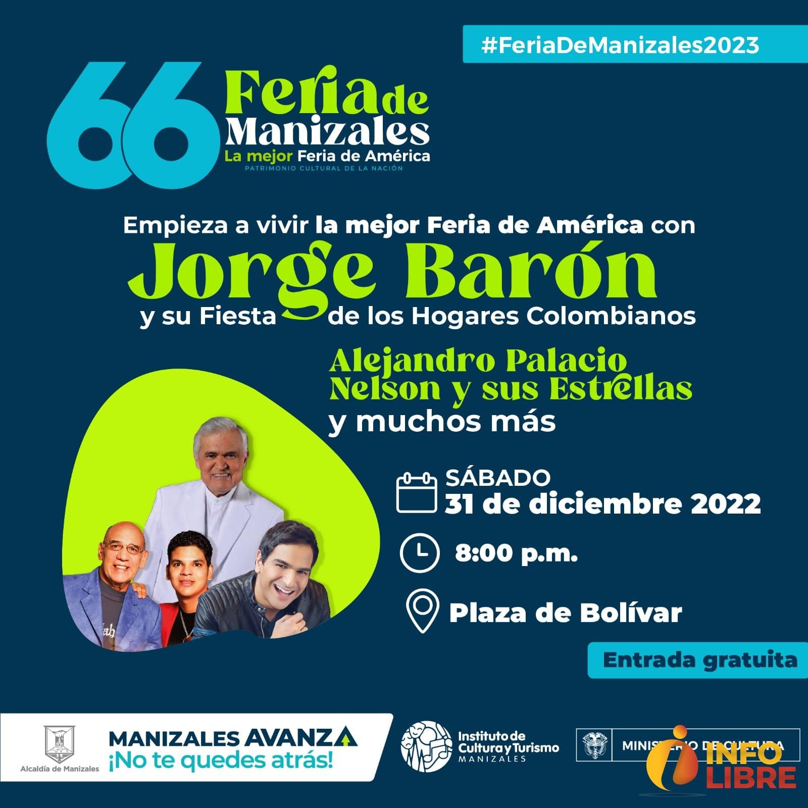 La sexagésima sexta Feria de Manizales está lista para comenzar a vivirse a partir de este 31 de diciembre, cuando todos los manizaleños y quienes han llegado ya a la ciudad se congreguen en la Plaza de Bolívar para recibir el 2023 con Jorge Barón y su tradicional Fiesta de los Hogares Colombianos.