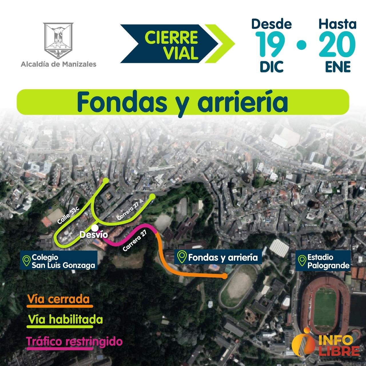 Desde hoy y hasta el próximo viernes 20 de enero, la Secretaría de Movilidad realizará cierre vial de la carrera 27 A con calle 54, detrás del colegio INEM, hasta la esquina de la Normal Superior de Manizales. Esto con el propósito de dar paso a la organización de las tradicionales Fondas y Arrierías que, año tras año, se realizan en el marco de la Feria de Manizales. La ruta alterna será la Avenida Paralela.
