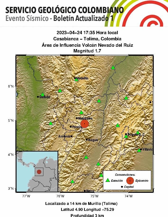 Se registra temblor de magnitud 1.7 en la Región de Casabianca – Tolima, Colombia, en el área de influencia del Volcán Nevado del Ruiz. El sismo tuvo lugar a las 17:35 hora local del 24 de abril de 2023, con una profundidad de 3 km y una latitud de 4.90 grados Norte y longitud de 75.29 grados Oeste.